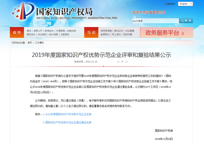 國家知識產(chǎn)權(quán)示范企業(yè)是國家對企業(yè)知識產(chǎn)權(quán)創(chuàng)造、運(yùn)用、保護(hù)、管理等方面工作突出授予的最高榮譽(yù),也是國家給予企業(yè)知識產(chǎn)權(quán)管理工作的最高評價(jià)。通過評審的企業(yè)將作為地區(qū)知識產(chǎn)權(quán)發(fā)展的領(lǐng)頭羊,為知識產(chǎn)權(quán)發(fā)展提供有力支撐。
