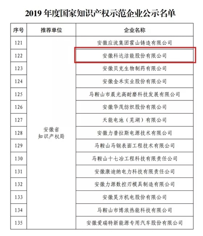 12月7日,國家知識產(chǎn)權(quán)局公布2019年度國家知識產(chǎn)權(quán)示范企業(yè)名單。安徽科達(dá)潔能股份有限公司榜上有名。