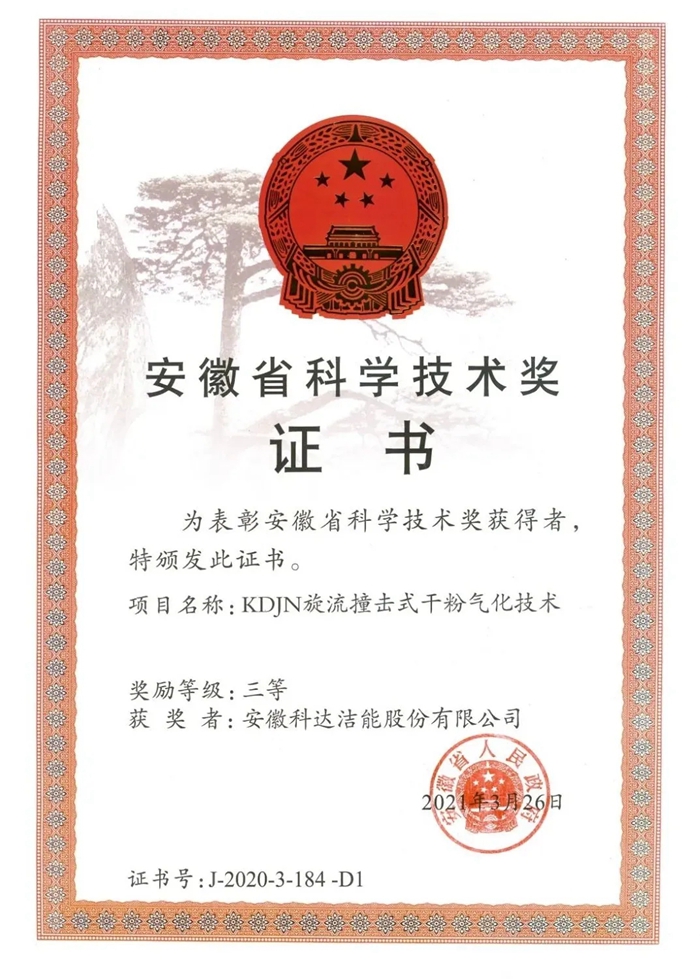 在日前召開的安徽省科學技術獎勵暨加快建設科技創新攻堅力量體系推進大會上,省委常委、常務副省長、省政協副主席鄧向陽宣讀了2020年度安徽省科學技術獎勵決定。安徽科達潔能股份有限公司的“KDJN旋流撞擊式干粉氣化技術”喜獲省級科技進步三等獎。