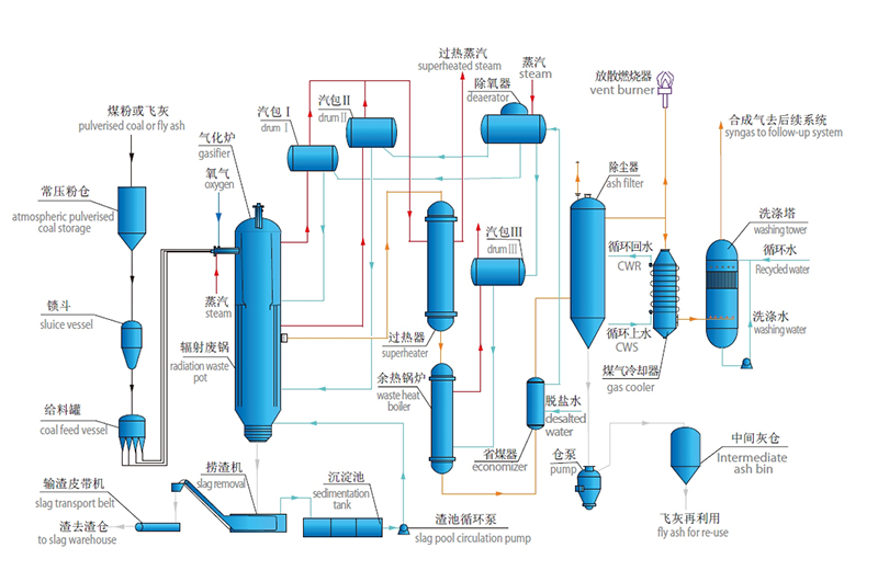 原煤經(jīng)過破碎后進(jìn)入磨煤系統(tǒng)制成合格煤粉,通過氣力輸送至常壓粉倉(cāng),再經(jīng)鎖斗、給料罐加壓送入氣化燒嘴,與氣化劑(純氧或高富氧、蒸汽)在燒嘴內(nèi)充分混合后進(jìn)入氣化爐反應(yīng)室,在極為短暫的時(shí)間內(nèi)完成升溫、揮發(fā)分脫除、裂解、燃燒及轉(zhuǎn)化等一系過程,最終形成以CO和H?為主要成分的粗煤氣離開氣化爐反應(yīng)室,粗煤氣和熔融狀態(tài)的渣在氣化爐中一起下行,渣經(jīng)激冷后進(jìn)入出渣系統(tǒng)由撈渣機(jī)及輸渣皮帶送人渣倉(cāng),粗煤氣經(jīng)輻射廢鍋、蒸汽過熱器、余熱鍋爐梯級(jí)換熱(產(chǎn)生蒸汽,一部分蒸汽裝置自用,另一部分外供)后,進(jìn)入除塵器將粗煤氣中的飛灰分離下來,產(chǎn)生的初凈化煤氣通過文丘里洗滌器及洗滌塔進(jìn)一步除塵降溫,所產(chǎn)生的潔凈煤氣送入客戶指定用氣點(diǎn)。