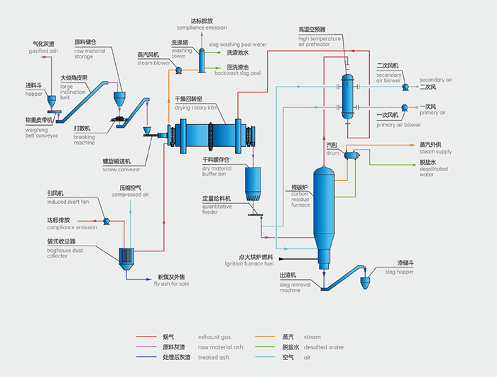 氣化灰渣經大傾角皮帶輸送至原料儲倉,經打散機破碎后送入干燥回轉窯中,干燥后灰渣送入保溫緩存?zhèn)},經高溫一次風定量吹送進入殘?zhí)紶t,與高溫二次風共同進行反應。